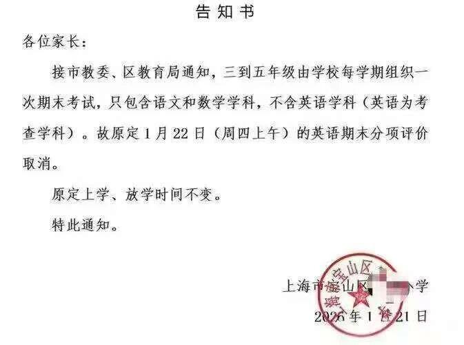 三到五年级期末只考语文、数学,原定的英语期末评价取消。